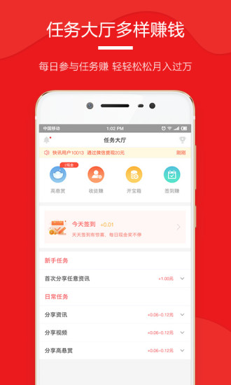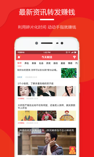 今天快讯让您实现边看新闻边赚钱的梦想,每位用户都能收获惊喜!注册完全免费,邀请好友还能获得额外奖励,更有机会参与10亿元大礼包的疯狂抢购活动。平台每日为您精心准备海量新鲜资讯和优质文章,确保您第一时间获取最有价值的内容。作为一款创新的赚钱软件,今天快讯还提供了便捷的分享功能,只需将有趣的新闻或文章分享到朋友圈、QQ空间等社交平台,当好友点击阅读时,您就能获得相应收益。赚钱就是这么简单!
