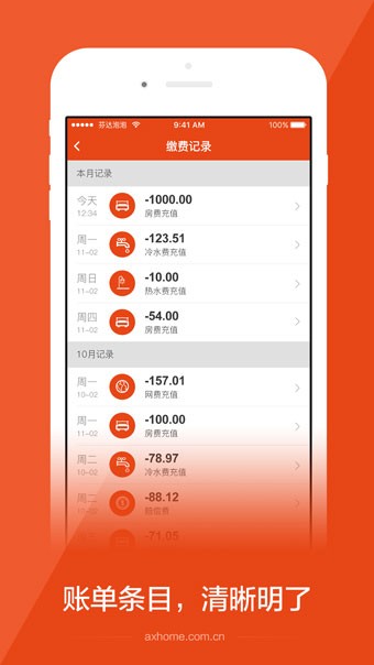账单条目,清晰明了 - 智能分类水电气等12项费用明细,消费记录一目了然