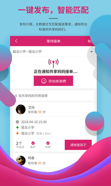 发布行程,大数据交叉配送需求,通知符合标准的共享妈妈们。系统会根据历史服务评价、距离远近等多维度因素,智能推荐最优服务提供者。
