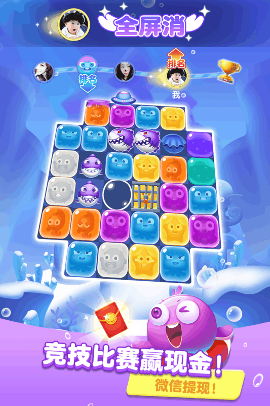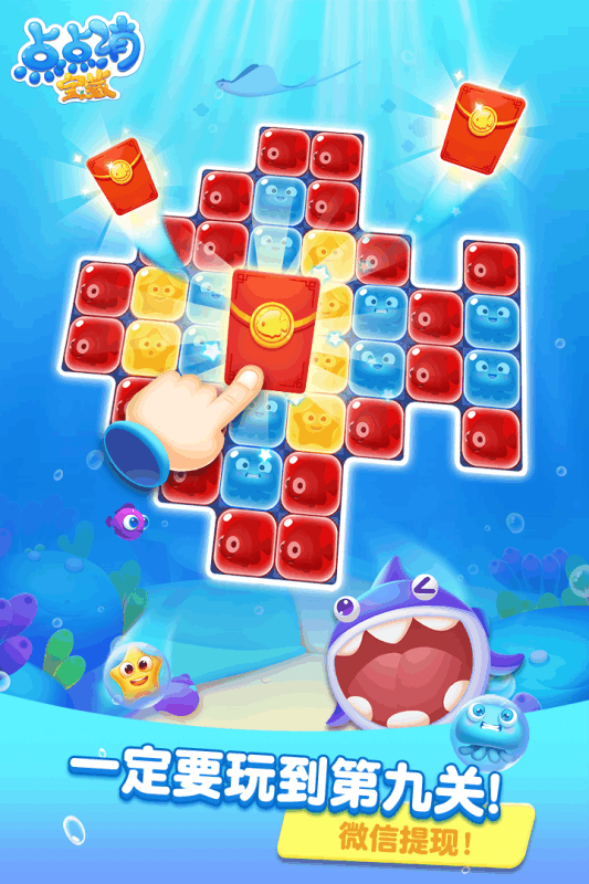 在游戏中玩家只需要点击两个或以上的同色方块即可消除,关卡中设置的可通过鲨鱼旁边的元素即可击败鲨鱼。游戏中的其他障碍物也可采用同样的方式消除。高难度的障碍物则需要在消除指定数量的元素之后产生道具,使用道具消除效果解除障碍。游戏特别设计了多种特殊元素,如冰冻方块需要连续消除两次,锁链方块需要消除相邻元素才能解锁,这些创新设计大大提升了游戏的可玩性和策略性。