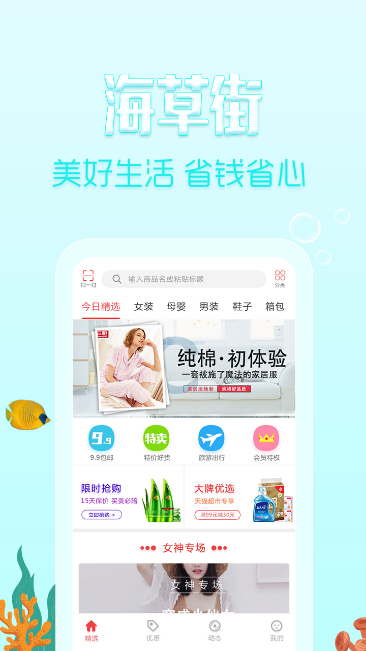 在海草街用价格尽享品质生活,会省钱购物的人都在这里。帮你锁定折扣好物,聚便宜聚划算,低价抢好货,天天白菜价,九块九包邮专场,让你一次嗨购,全都值得买!特卖不打烊,网购不剁手!!海草街还提供智能推荐功能,根据您的购物习惯为您推荐最适合的商品,让您的购物体验更加个性化。