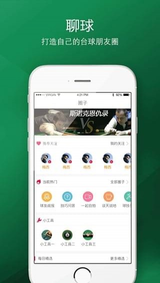 一个台球人自己的圈子,一个台球圈内的朋友圈,在这里你可以畅所欲言,在这里你可以寻找到你心中的对手,你喜欢的明星,你崇拜的,在这里你可以让自己也成为台球圈知名的大咖。平台定期组织线上挑战赛和线下聚会活动,让你有机会与各路高手切磋交流,拓展台球人脉圈。