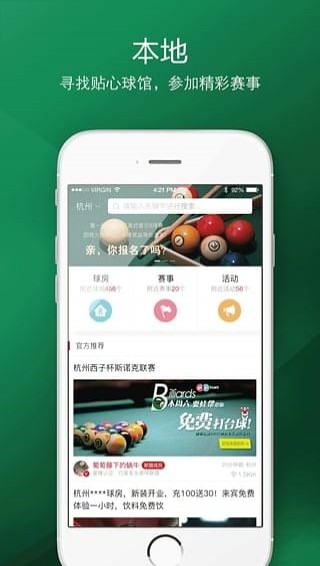 本地:寻找贴心球馆,参加精彩赛事。智能推荐附近优质球房,提供详细场地信息和用户评价,还能一键报名参加各类台球比赛。