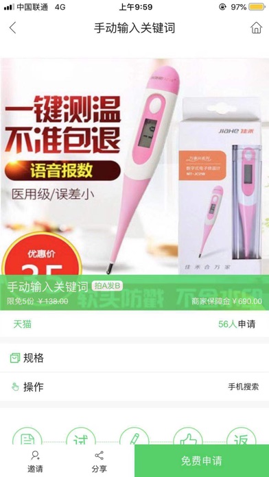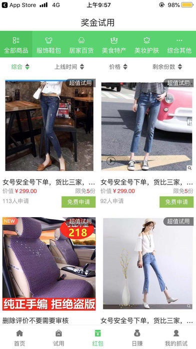 打开抓试网APP,在首页浏览海量试用商品,通过分类筛选或搜索功能快速找到心仪商品。每个商品页面都详细展示了试用要求、商品信息和申请人数,帮助用户做出明智选择。找到喜欢的商品后,只需点击"立即申请"按钮即可参与试用活动。