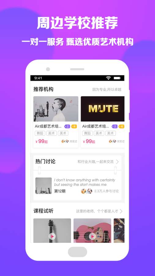 同等服务,更低价格,钜惠全城,0元体验。平台定期推出限时特惠课程和团购活动,最高可享5折优惠。新用户注册即送价值299元的艺术启蒙大礼包,包含专业测评和名师指导课程。