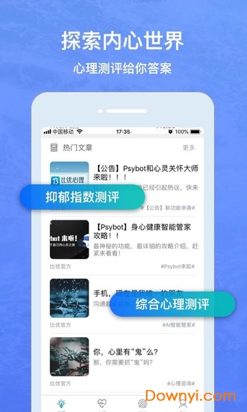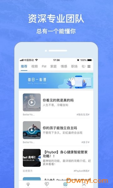 或是面对成长、恋情、职场、家庭、亲子等等问题需要指引?比优心理app就像一位24小时在线的知心朋友,随时准备倾听您的心声并提供专业建议。