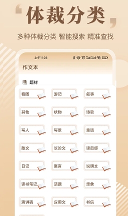 软件拥有海量的作文素材库,涵盖记叙文、议论文、说明文、应用文等22种常见作文类型。每种类型都配有详细的写作指导,包括写作要点、结构安排、常用表达等。用户可以根据自己的学习需求,选择相应的作文类型进行专项训练。