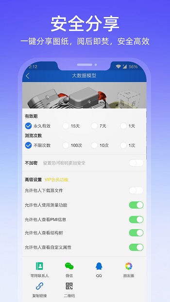 【随心所欲的分享】可以通过微信、邮箱等社交工具,向同事及好友分享DWG图纸、Revit模型等专业文件。分享方式灵活多样,支持链接分享和文件直接发送,还能设置访问权限和有效期。无论是临时协作还是长期项目,都能找到最适合的分享方式,让技术沟通更加高效顺畅。