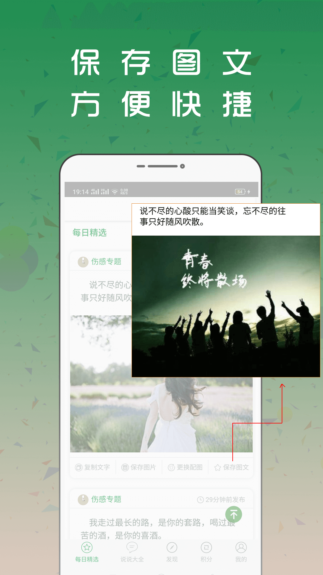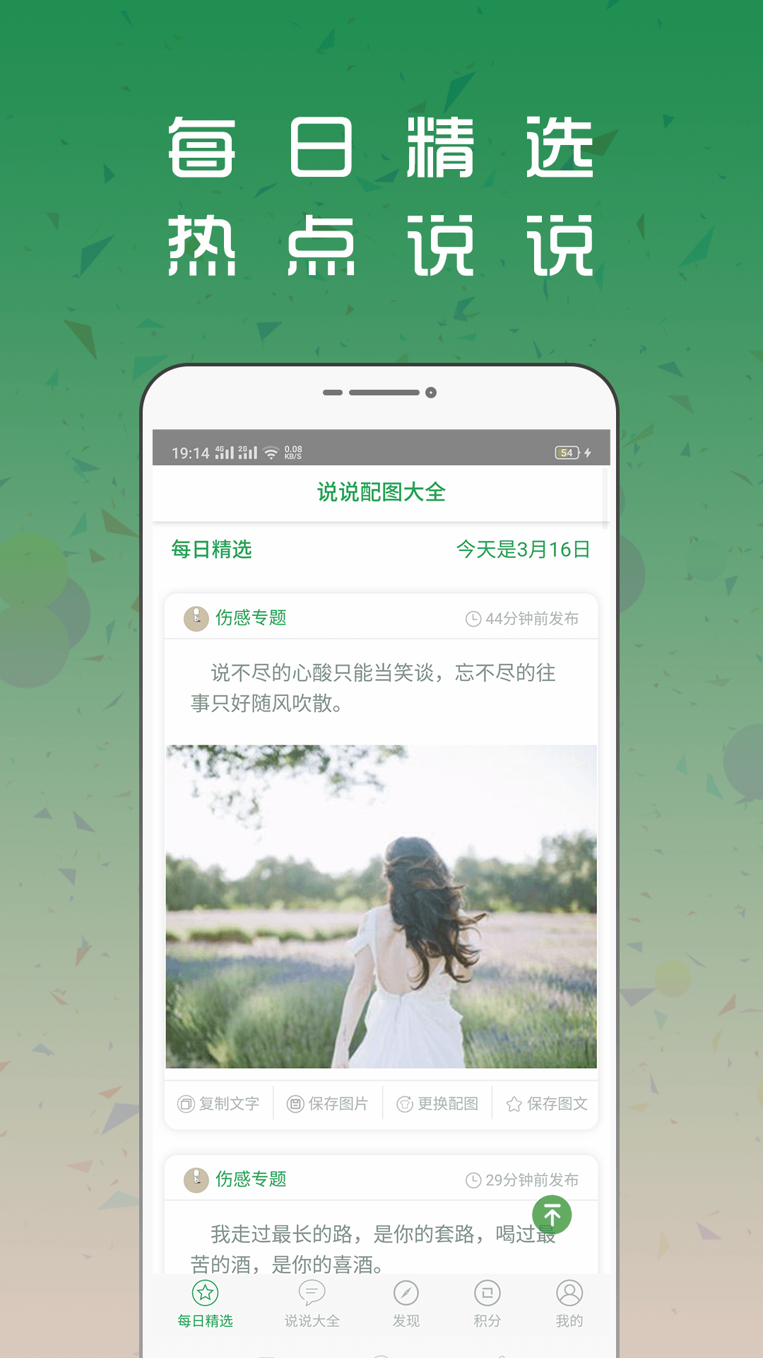 说说赞配图大全特别适合快节奏生活中的现代人使用,它能帮助用户在碎片化的时间里快速找到想要表达的内容,省去了到处搜寻素材的麻烦。无论是发朋友圈、QQ空间还是其他社交平台,都能在这里获得理想的配图与文字。应用还支持一键分享功能,让精彩内容可以即时传递。空间说说赞配图大全,不仅是一个工具,更是你社交生活中的得力助手,为你的每一次分享点赞加油!