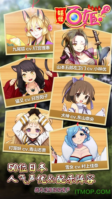 多达50位以上日本声优配音助阵!游戏邀请了日本一线声优为每个角色注入灵魂。日笠阳子[打工吧!魔王大人-勇者艾米莉亚]、东山奈央[伪恋-桐崎千棘]、钉宫理恵[绯弹的亚莉亚-神崎·H·亚莉亚]、小林优[-莎夏]等…著名动漫声优担纲配音演出,赋予每位妖怪美少女鲜明独特的性格!游戏配乐由知名VocaloidP的PolyphonicBranch[初音未来-二次浴∩リームフィーバー]担任制作,精心打造的游戏原声带让玩家仿佛置身于妖怪世界。恰到好处的音乐节奏打造身临其境的游戏氛围!