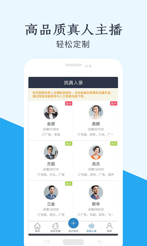 签约专业配音演员提供定制服务,用户可直接联系心仪主播,获取独家声音授权。