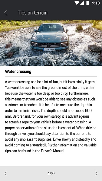 越野助手应用程序在新款Cayenne车型(2018年款)中提供。运行该应用程序需配备罗盘显示屏。建议在使用前确保手机电量充足,并安装专用手机支架以获得最佳拍摄效果。首次使用时需要进行简单的GPS定位校准,以确保路线记录的准确性。