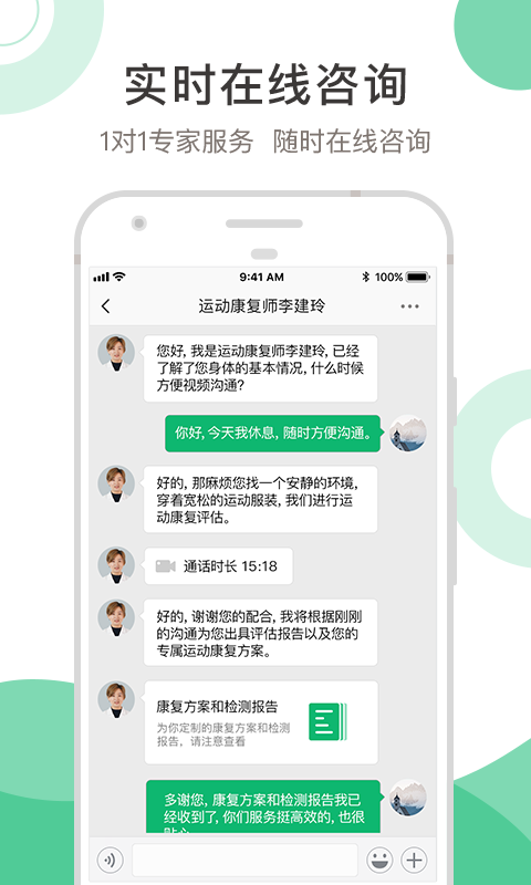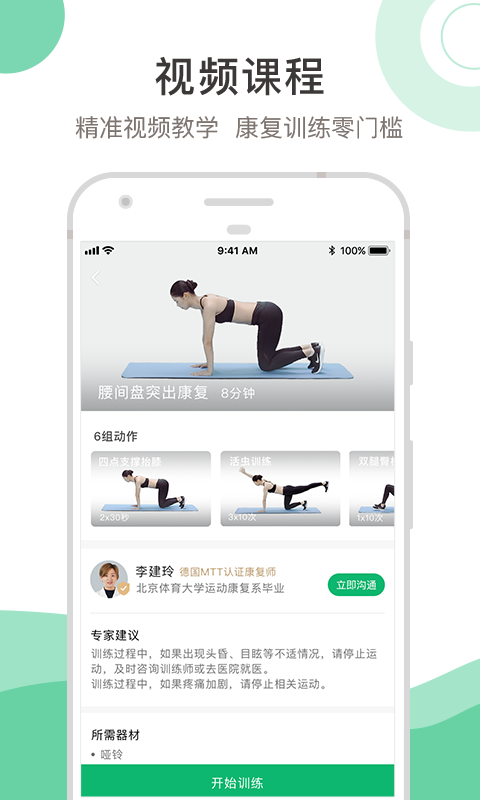 app内提供丰富的视频课程资源,让您可以在家或任何合适场所自主完成康复训练。训练过程中遇到任何问题,都可以随时与康复师沟通交流,获得专业指导。