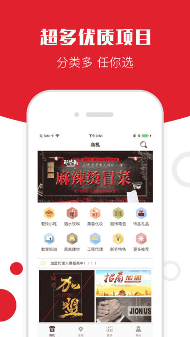 餐饮、服装、家居、珠宝、建材等30大传统热门加盟行业,云集火锅、快餐、一对一辅导、幼儿早教、机器人教育、鸡排、英语培训、奶茶等时下热门开店项目,满足您个性化的投资需求。每个项目都经过严格审核,确保投资安全可靠,让您轻松找到最适合自己的创业方向。