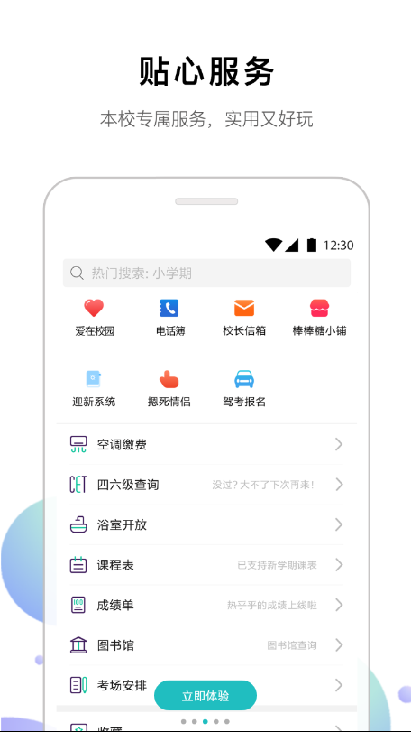 作为校园生活的得力助手,安外e通app集成了多项实用功能。学生可以通过app轻松查询成绩单、四六级考试成绩、图书馆藏书信息以及浴室开放情况等。同时,app还内置了课程表功能,帮助学生合理安排学习时间。这些功能都经过精心设计,操作简单直观,让学生们能够随时随地获取所需信息。
