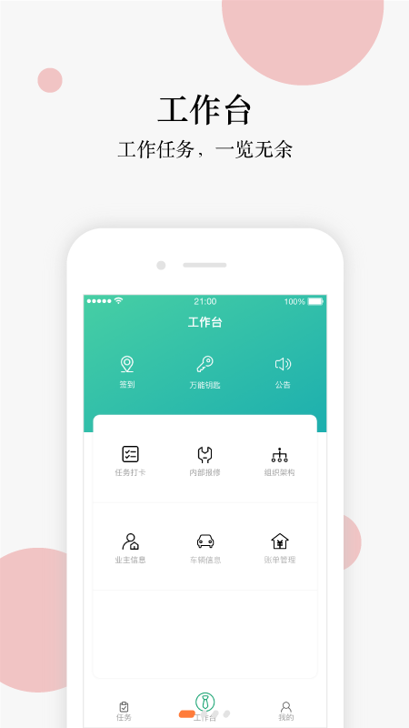 工作台:作为核心工作界面,工作台采用网格化设计理念,将物业管理的各项任务科学分类。管理者可以通过后台灵活配置任务模块,员工则能一站式处理日常工作。这种设计既保证了工作条理性,又提升了操作便捷性。