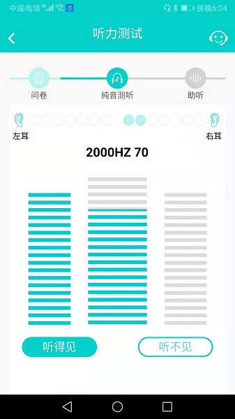 当听到测试音时,通过界面上的加减按钮调整音量,直到声音刚好能被感知。这个阈值将作为该频点的听力敏感度基准。