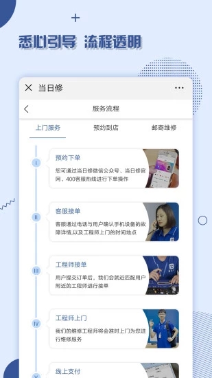 当日修app以"高质、高效、高水平"为服务宗旨,汇聚了经验丰富的专业维修团队。所有工程师都经过严格的技术考核和岗前培训,确保每位用户都能享受到最专业的维修服务。针对不同用户的维修需求,app提供多种服务方式:上门维修服务让您足不出户就能解决手机问题,维修师傅会在一小时内到达指定地点;到店维修服务让您享受即到即修的便捷体验;邮寄维修服务则让异地用户也能轻松获得专业维修。