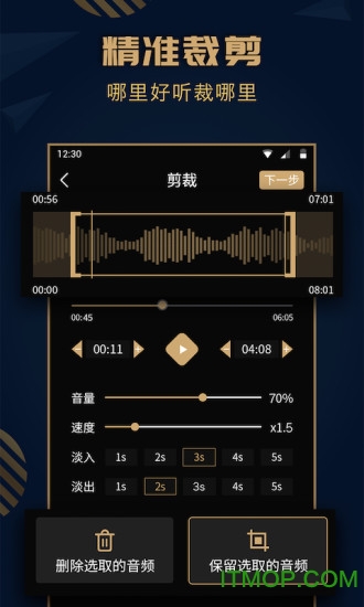 【音频精准裁剪】支持对MP3、AAC、M4A等多种主流音频格式进行精确剪辑,用户可以自由设定裁剪范围,确保每一段音频都能完美呈现。