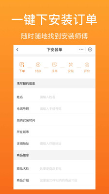 师傅管理:整合全国优质安装服务资源,基于LBS定位智能派单,支持师傅资质审核、服务评价和分级管理,确保服务质量。