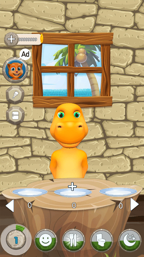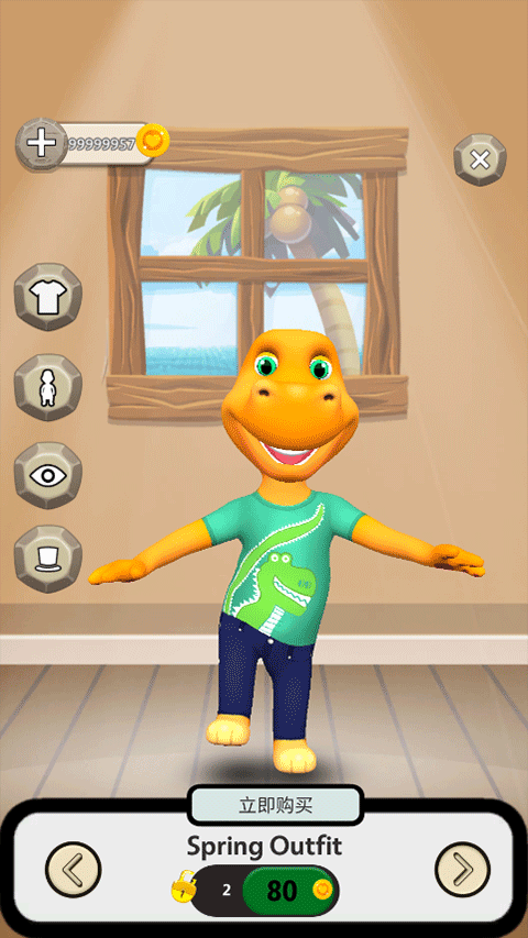 初次进入会说话的恐龙最新版时,你会发现它的玩法非常容易上手。就像照顾宠物一样,你可以通过触摸屏幕与恐龙互动,抚摸它、逗弄它或者轻轻打它,观察它不同的反应。游戏界面下方设有多个功能按钮,点击可以切换不同的互动场景。在食物界面,你可以购买各种水果、饮料来喂养恐龙;在服装界面,可以给恐龙换上不同风格的服饰和配饰;还有专门的洗澡和睡觉场景,让你全方位照顾恐龙的生活起居。