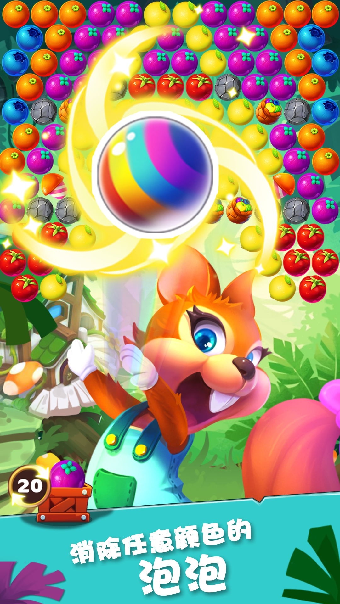 泡泡农场大作战将经典的泡泡龙玩法与农场经营巧妙融合,创造出一个充满魔法的童话世界。在这个奇幻森林里,邪恶的魔法泡泡困住了可爱的小动物们,只有最勇敢的小松鼠才能解救它们。游戏不仅考验玩家的射击技巧,还需要合理规划水滴资源来经营农场。随着冒险的深入,你会遇到各种有趣的NPC角色,他们将为你的旅程提供帮助。每个关卡都经过精心设计,难度循序渐进,保证玩家能获得持续的新鲜感和成就感。