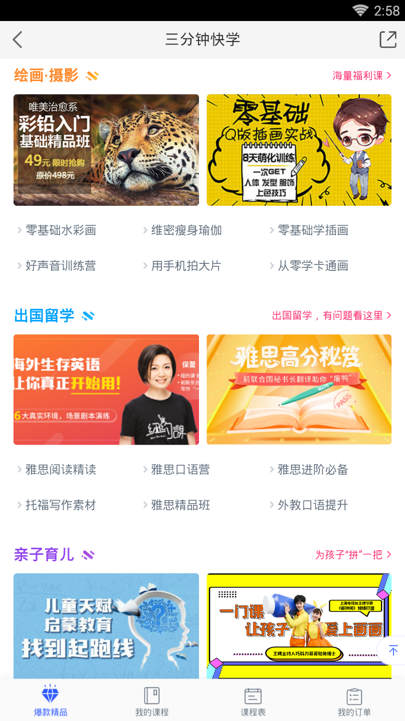 三分钟快学是一款集学习、交流、互动于一体的综合性在线教育平台。平台课程资源丰富多样,包括英日韩小语种、各类技能培训、考研考证辅导、IT技术学习、设计摄影教程、绘画音乐教学以及小学初高中精品课程等。所有课程均由专业教师团队精心打造,确保教学质量和学习效果。