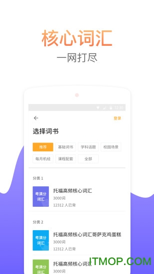 考满分词汇拥有业内最全面的托福词库,所有词汇都按照词频、考试科目(听说读写)以及自然科学、人文社科等十余个学科话题进行精细分类。这种科学的分类体系让您可以根据自身需求选择最适合的词书,实现精准高效的备考。