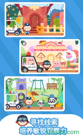 案件多样:游戏设计了数十种不同类型的案件,包括物品遗失、小偷追捕、交通疏导、走失儿童救助等,每个案件都有独特的解决方式,让小朋友们体验不同的破案乐趣。