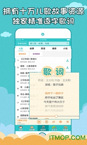 ipad手机版下载是一款专为儿童设计的优质儿歌软件,它不仅拥有丰富多样的儿歌资源,还巧妙地将经典名著、童话故事等内容融入其中,让孩子在轻松愉快的氛围中学习知识、培养兴趣。这款软件界面简洁友好,操作便捷,深受广大家长和孩子们的喜爱。无论是想让孩子学习传统文化,还是希望通过音乐激发孩子的创造力,这款软件都能满足您的需求。现在就来IT猫扑下载体验吧,为孩子的成长增添更多乐趣!