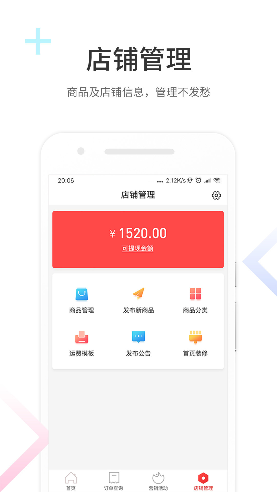 店铺设置包括店铺切换、店铺门头照、店铺头像、店铺名称、店铺二维码、店铺地址等选项。新增店铺装修模板库,提供多种风格选择,一键应用即可打造专业级线上店铺形象。