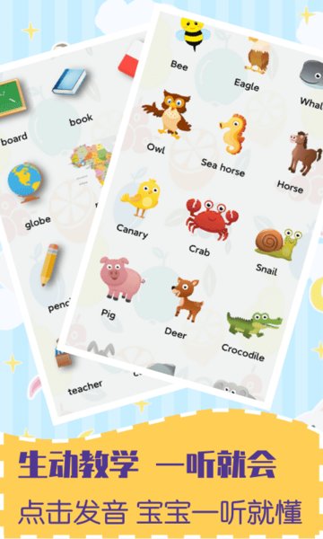 采用专业外教录制的标准发音,配合趣味互动设计,让宝宝在点击发音的过程中自然而然地掌握单词发音技巧。