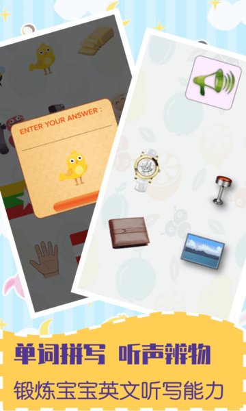 创新的听写训练模式,通过声音提示和图片提示相结合的方式,全面锻炼宝宝的英文听写能力和反应速度。