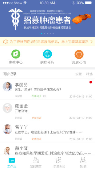 抗癌助手医生版是一款专为癌症治疗医生设计的专业医疗沟通软件,旨在搭建医患之间的高效沟通桥梁。通过这款智能化的医疗辅助工具,医生可以随时与患者保持联系,及时了解他们的病情变化、治疗进展和心理状态,从而提供更加精准的个性化治疗方案。软件支持文字、语音、图片等多种沟通方式,让医患交流突破时空限制,特别适合需要长期随访的肿瘤患者。此外,系统会自动记录患者的各项指标变化,生成可视化数据报告,帮助医生更全面地掌握患者情况。觉得这款软件能提升诊疗效率的医疗工作者,现在就可以下载体验了!