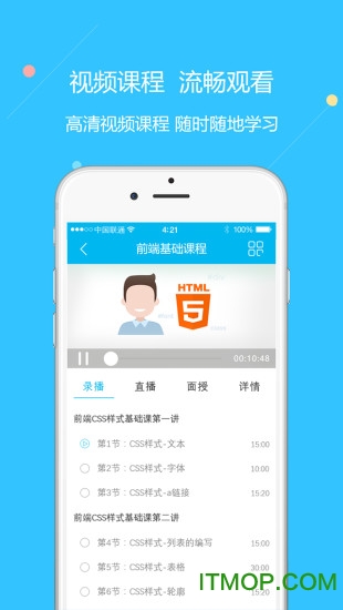 在线录播:章节学习、笔记回看、课程收藏、评论打分、进度跟踪等。