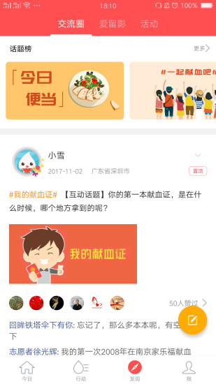 交流圈:打造专属献血者的互动平台,用户可以在这里结识志同道合的"热血伙伴",分享健康生活方式,讨论科学献血知识,还能参与平台组织的各类线上线下活动。