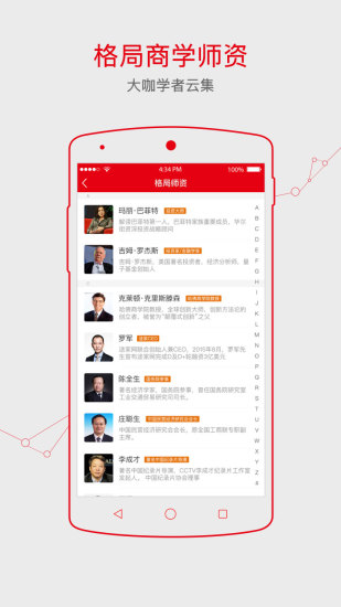 课程体系:目前已上线包括思想的格局、格局新资本、管理精要、家长学院和物业菁英在内的五大精品课程。通过App,您可以实时掌握全年课程安排,第一时间获取课程通知和讲师资料,课后随时查阅和下载课件及学习笔记。