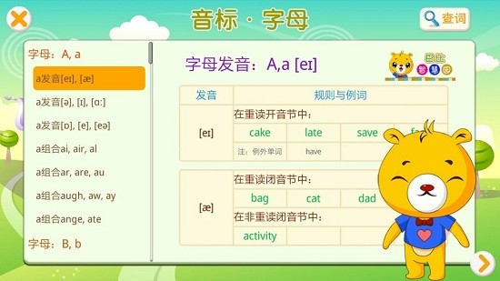 形象生动的卡通配图、标准的笔顺书写演练,学认音标的同时,还可以一笔一划地练习。每个音标都配有动态书写演示,让孩子直观掌握正确书写顺序。