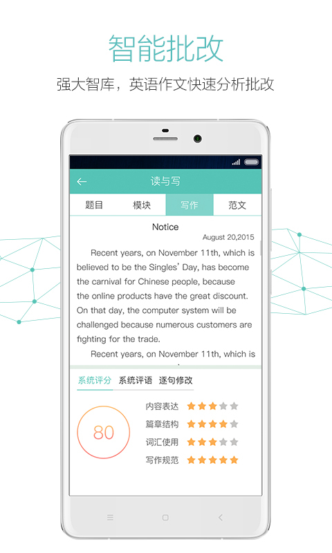 智能词汇学习系统通过算法分析用户的掌握程度,精准推送需要重点记忆的单词,避免重复学习已掌握词汇,大幅提升背词效率。阅读与完型训练模块采用真题与模拟题交叉呈现的方式,每完成一个学习单元都会即时生成详细的学习报告,配合名师解析视频,让用户全面了解自己的学习情况。长难句与翻译模块由资深教师亲自讲解,通过科学的句子结构分析和重点词汇标注,帮助用户深入理解复杂句式,为阅读、翻译和写作打下坚实基础。智能写作批改系统就像一位随时在线的私人教师,不仅能提供专业的修改建议,还提供大量优质范文模板,支持自由复制和背诵,让写作学习变得更加轻松高效。