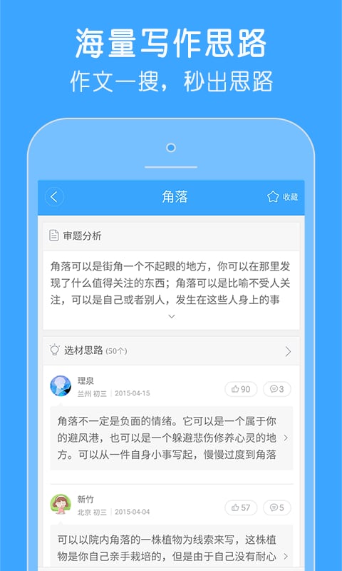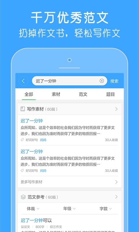中小学作文素材、思路:作文一搜,秒得作文素材和思路!全网唯一能搜到优质作文素材思路的中小学作文提分神器!系统会根据用户搜索关键词智能推荐相关素材,从名人名言到时事热点,从历史典故到科学发现,应有尽有。