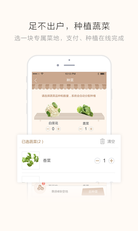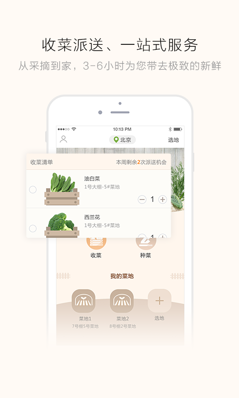 线上挑选菜地功能让您轻松拥有专属农场。只需登录APP,浏览精心规划的菜地布局,选择心仪的地块完成支付,并为它取个独特的名字,就能成为这块菜地的主人。种植环节完全个性化,您可以根据家人的口味偏好,从丰富的蔬菜品种中选择想要种植的作物,我们的专业团队将采用最严格的有机种植标准为您培育。为了确保全程透明,我们在每块菜地都配备了高清视频监控系统,让您24小时都能通过手机查看蔬菜的生长实况。当蔬菜成熟时,智能系统会第一时间提醒您,只需简单点击收菜按钮,新鲜采摘的蔬菜将在3-6小时内配送到家。如果您想体验农耕乐趣,还可以预约上门采摘服务,亲身感受收获的喜悦。