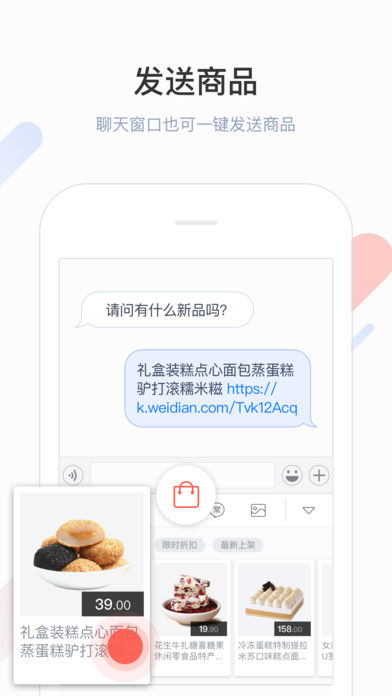 【店铺商品】独创的商品快捷发送功能,点击即可发送商品信息,长按可生成分享链接,让商品推广变得前所未有的简单;
