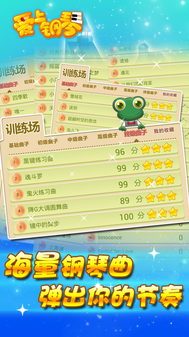 上万首精品乐曲,持续在线更新,涵盖各种音乐风格和难度等级;全球联网PK模式让你与世界各地玩家同台竞技,独创冠名曲带来全新挑战体验;创新的成绩及金币系统让音乐学习充满成就感;实时更新的音乐榜单为你推荐最新最热乐曲;智能分类的乐曲库让音乐检索更加便捷;用户排行榜展示你的演奏风采;一键收藏功能方便管理个人歌单;极简操作设计让游戏轻松上手;专业级钢琴音效,特别加入重低音效果;完美支持中英文双语界面。