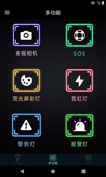 本程序功能齐全,具备了手电照明、警报、求救,屏幕照明、警报、信报等功能,还支持多种功能设置,支持皮肤切换、多种语言,非常实用的一款手电筒哦;丰富的功能组合满足不同场景需求,从日常照明到紧急求救一应俱全。