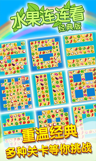 全球热门经典连连看消除游戏,你可以一个手指玩到底,好玩的快速简单消除游戏,没有之一,关卡设计与电脑经典版的连连看整体同步,并结合了手机平板设备做了完美的适配。水果连连看经典,专为手机游戏而生!超过1000个关卡,关关精彩!不管你是菜鸟还是高手,这里都适合你!爱上水果连连看,么么哒!一起来水果消消乐吧!