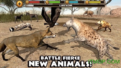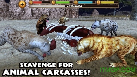 通过左下角的虚拟摇杆可以控制鬣狗移动,右下角的动作按钮则可以实现攻击、咆哮等行为。随着游戏进程,你还能解锁更多特殊技能。