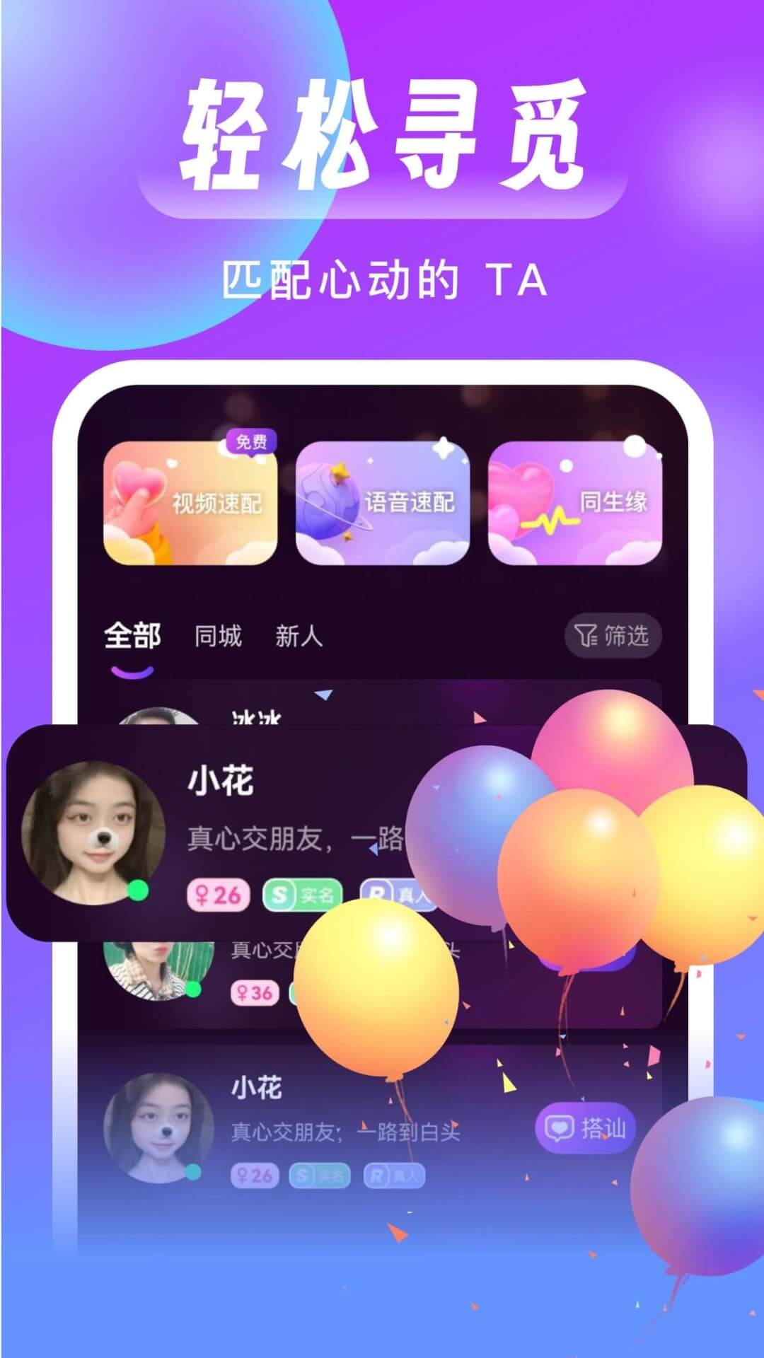 同城来聊是一款专为单身男女打造的约会交友软件,让你轻松结识同城陌生人,开启浪漫邂逅。在这里,只需一分钟就能匹配到附近的单身妹子,开启一段奇妙的缘分之旅。通过视频聊天功能,你可以真实感受对方的魅力,多元化的社交玩法让交友过程充满乐趣。无论是分享生活动态,还是寻找志同道合的好友,这里都能满足你的需求。告别孤独,享受同城约会的别样情趣,让每一次相遇都充满惊喜。