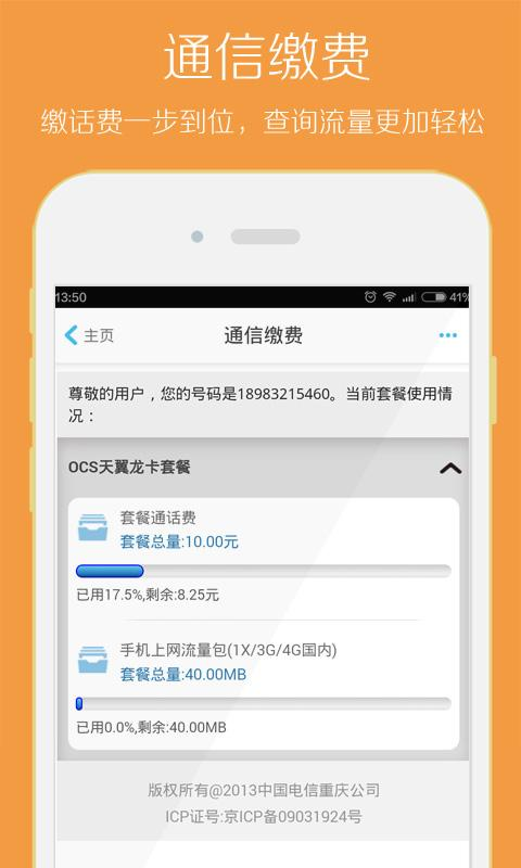 手机充值:支持电信用户查询账单、充值话费、办理流量套餐等业务。经常推出专属优惠活动,让您享受更实惠的电信服务。