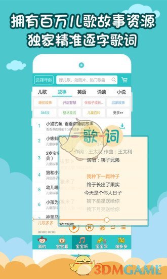 经典儿歌童谣、动感节奏儿歌、睡前安抚音乐、英文儿歌故事、阿凯叔叔讲故事、妈妈说故事、古诗、诗词朗诵、幼儿百科全书、奇妙大百科、历史故事、伊索寓言......