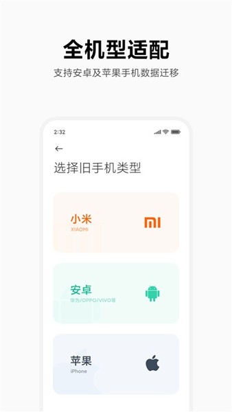 根据旧手机类型选择对应选项(小米手机/其他安卓手机/iPhone)。